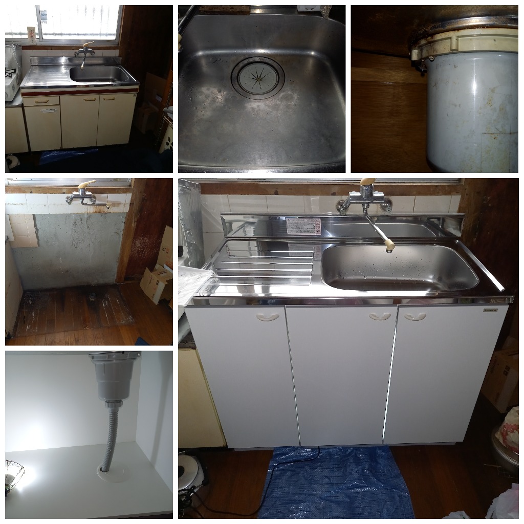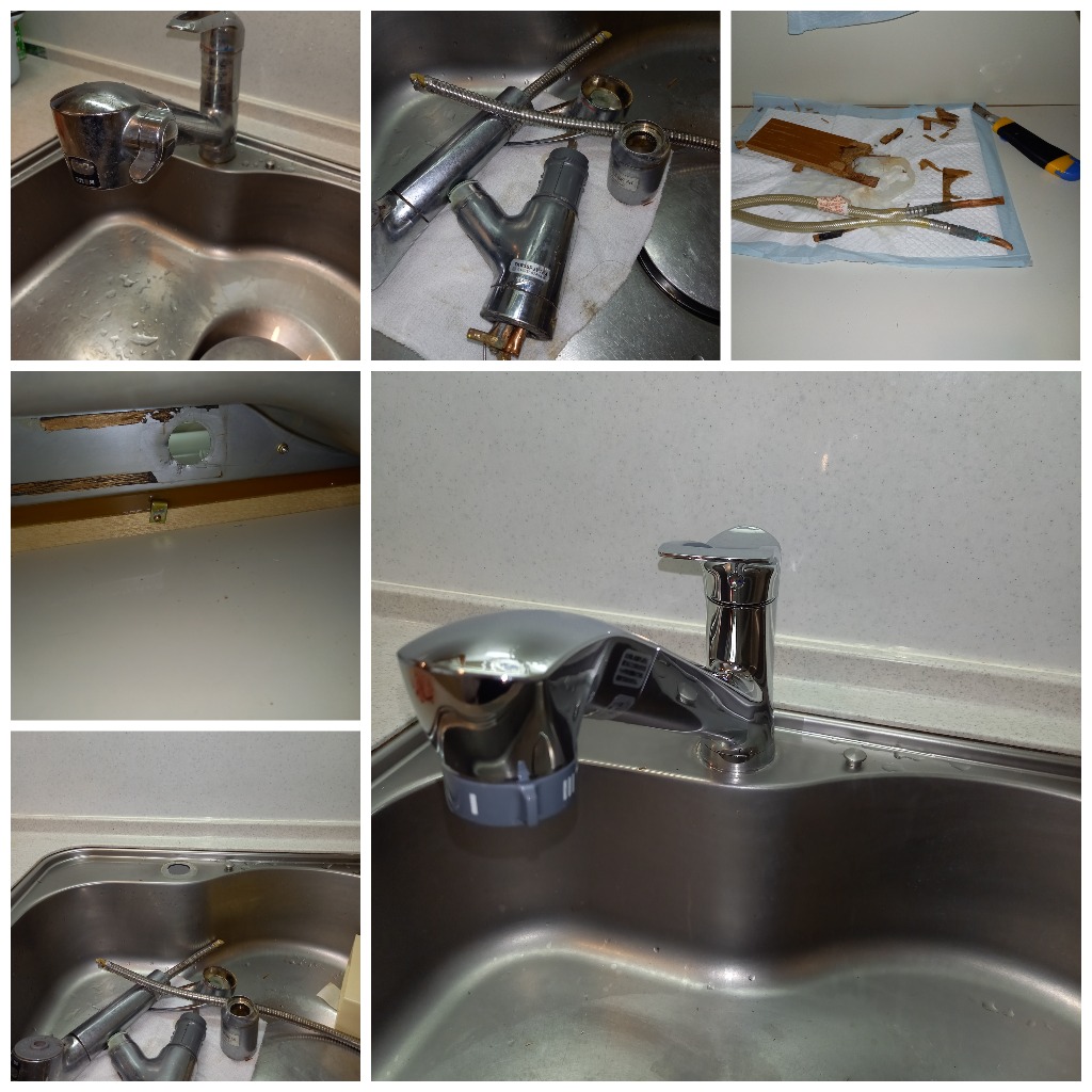 おはようございます。台所下で水漏れしているとの依頼で見に行きますと、どうやら排水栓あたりから漏れているようでした。この場合だいたいはパッキンの劣化かシンク側で錆びて穴が開いているかになります。今回はシンク側に数ヶ所穴が開いていました。修繕としてはコーティングなどで何とか穴を塞いで水漏れがしないようにするか、あるいはキッチンシンクの取替になります。こちらのお客様はキッチンシンクの取替をご希望されましたので、後日再訪して取替させて頂きました。淀川区では台所水栓の交換でした。既存の水栓がTOTOの水栓でして、まあ固着が凄くて全く動かない。通常の外し方はあっさり諦め、お客様に時間の融通を聞いて頂き下側からゆっくり3~40分かけて外しました…💦