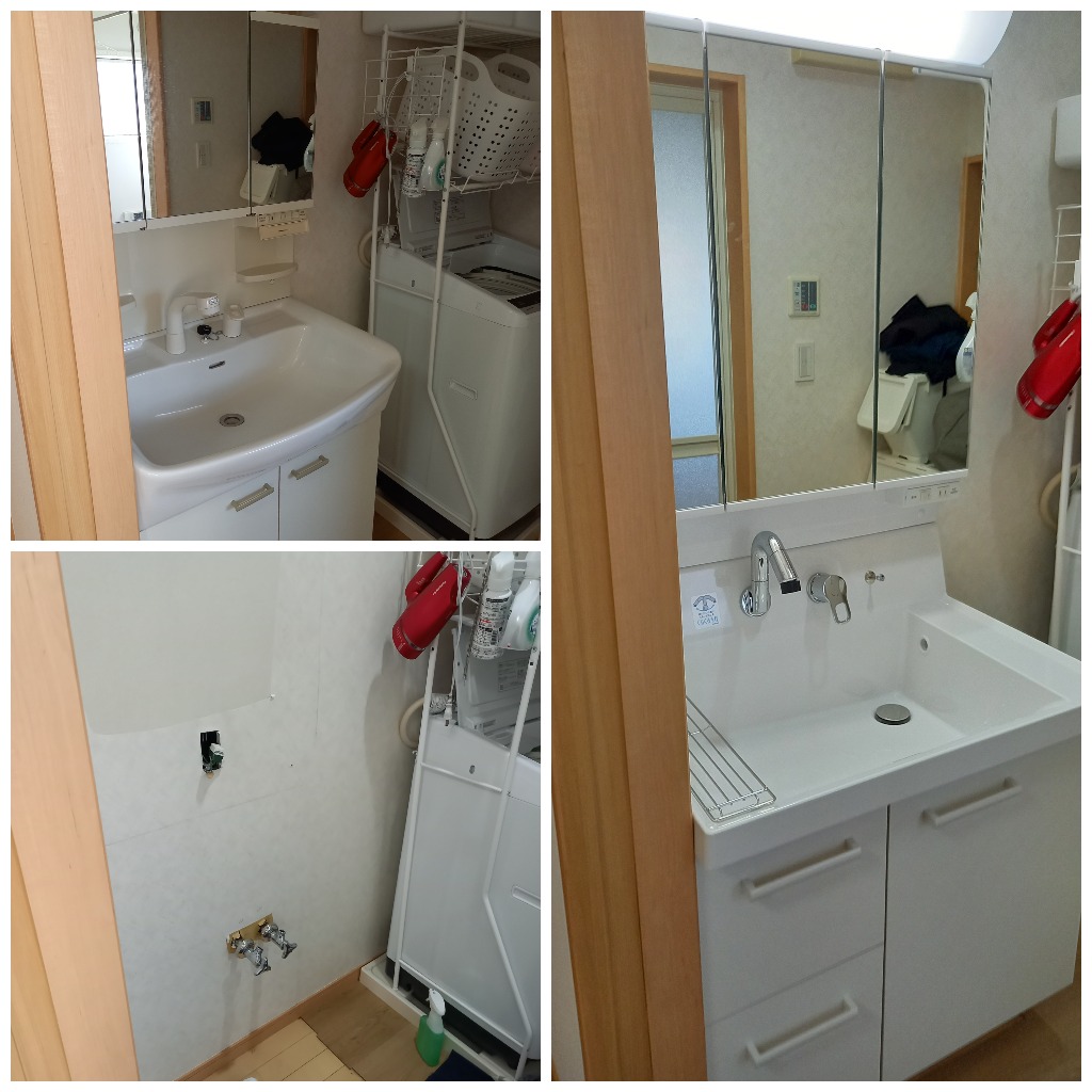 京都市西京区、神戸市中央区からトイレの交換ご依頼です。たまたまどちらも隅付きタンクのタイプから密結タイプへの交換でした。トイレの室内が広ければこちらの方がやっぱり見た目も良いですよね。6月7月とトイレ便器交換が多くなってる気がします。同じ神戸市中央区から洗面台交換のご依頼です。間口600mmはさほど重くもないのでスムーズに作業完了です。どちらも便器タンク、洗面台とお客様がご購入された商品の取替工事、廃材処分になります。このパターンが、同じ商品でも一番お安くなりますね。