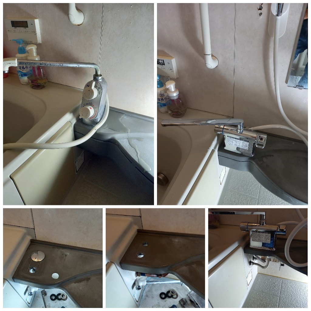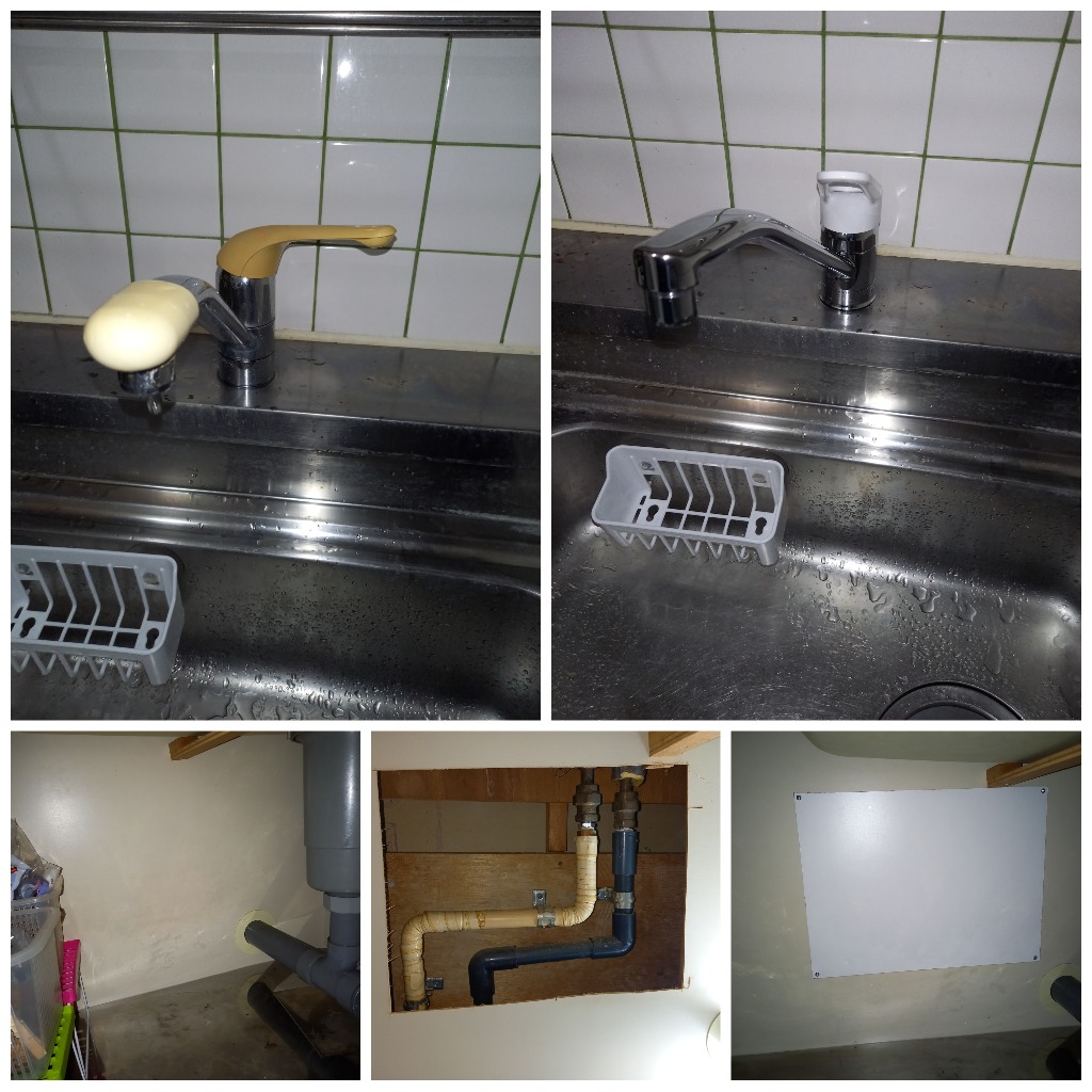 八尾市から浴室水栓水漏れのご依頼です。事前のやりとりでいまいちどのような水栓か分からなかったので、現地調査に伺いました。なるほど私も見たことのないお会いするのは初めての水栓でしたので、お電話では理解できませんでした。現在販売されているデッキタイプへの交換をお客様がご希望されましたので、新しく穴を開け以前の穴を塞ぎ、取り付けさせて頂きました。住之江区からは台所水栓の交換です。修理をご希望でしたが、さすがに下吐水の水栓なので、交換をオススメ致しました。